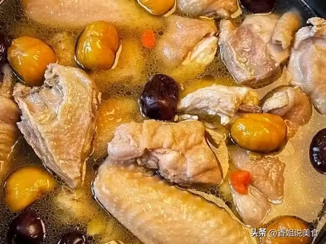 3、燉煮好之後,再放入紅棗、板栗仁、枸杞子,繼續燉煮二十分鐘。最後加入食鹽調味,攪拌均勻入味後即可出鍋開吃。