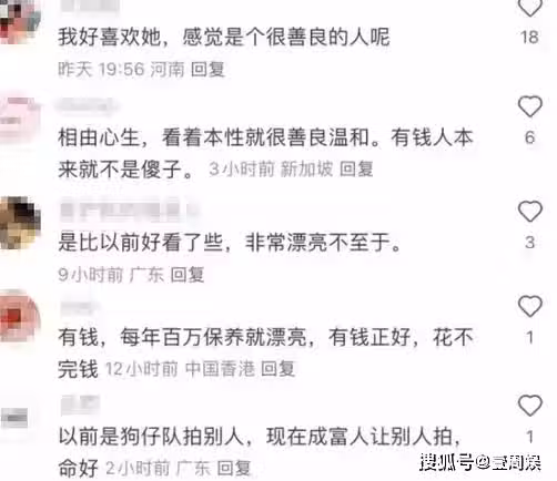 不少網友紛紛留言:「我好喜歡她,感覺是個很善良的人呢。相由心生,看著本性就很善良溫和,有錢人本來就不是傻子。是比以前好看了些,非常漂亮不至於。有錢,每年百萬保養就漂亮,有錢真好,花不完錢。以前是狗仔隊拍別人,現在成富人讓別人拍,命好!」