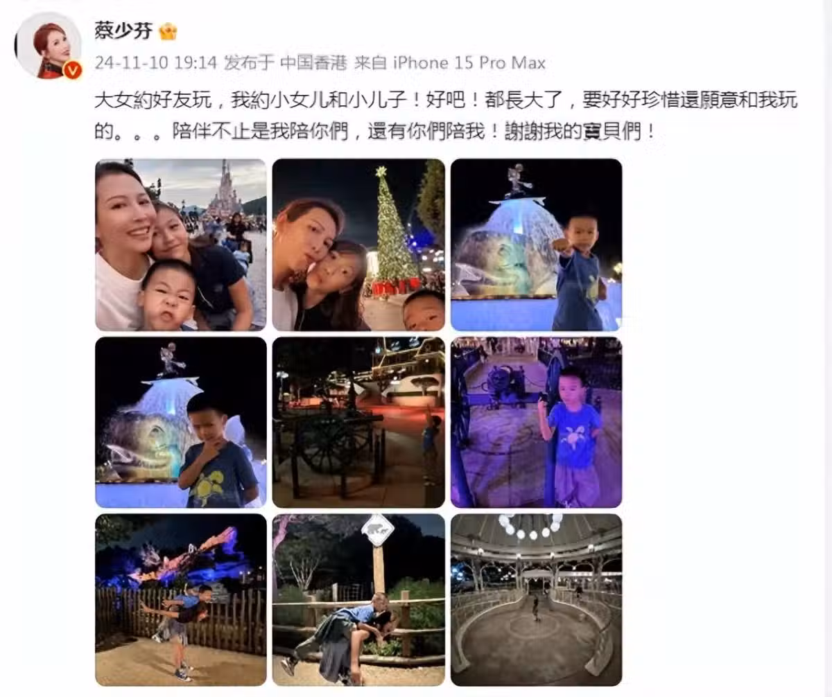 11月10日晚,演員蔡少芬在個人社交平台分享了一組帶小女兒包子和三胎兒子魚蛋出遊的溫馨合照,她還開心發文稱大女兒湯圓約著好友出去玩了,自己則約小女兒和小兒子出遊,一家人各玩兒各的,都很悠閒愜意啊。蔡少芬還感慨孩子們都長大了,因此要好好珍惜小傢伙們願意和自己玩兒的日子。文末,蔡少芬感性寫道:「陪伴不止是我陪你們,還有你們陪我,謝謝我的寶貝們」,真的好感人。