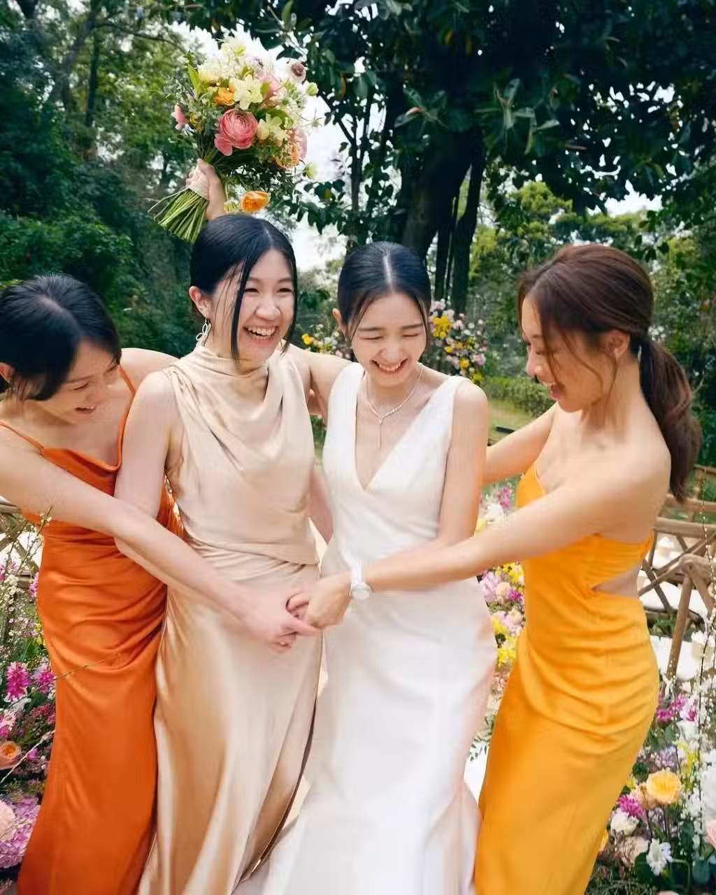 照片中可以看到麥明詩身穿Deep V的純白婚紗,並手捧鮮花望著鏡頭笑到見牙不見眼,而身邊的友人就各自穿上橙色系的連身長裙,畫面十分和諧。