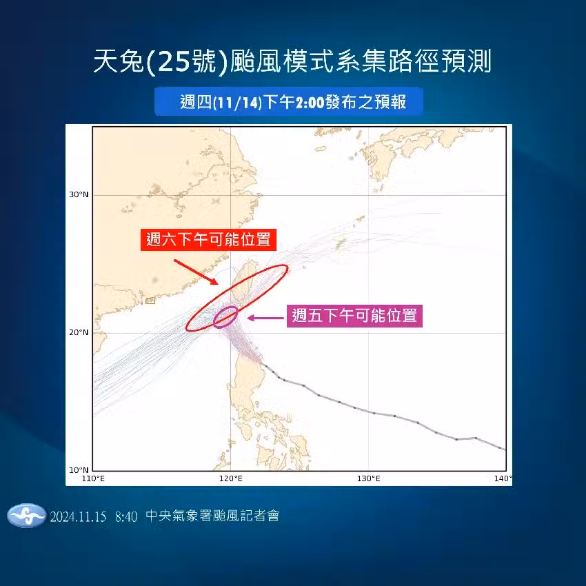 關於後續發展,則可能會在傍晚登陸後,於本島上空或是出海後消散為熱帶低壓,「若颱風沒有減弱,可能周日還會在台灣上空」,但目前狀態仍不明朗。