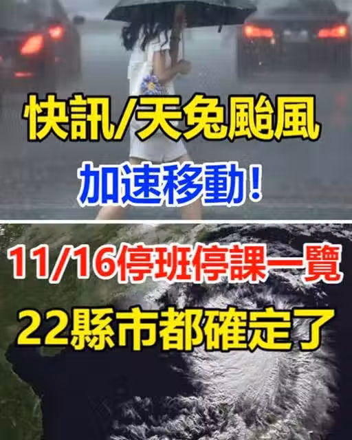 快訊 / 天兔颱風加速移動!全台「11/16停班停課」一覽,22縣市都確定了!!