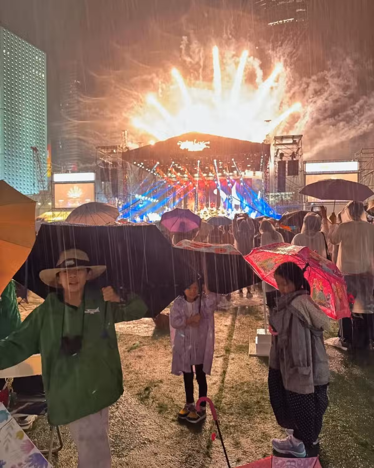 儘管天公不作美,下起了大雨,但似乎也不影響一家人看音樂會的心情。霍啟剛還曬出子女在雨中嬉戲的畫面,儘管衣服被雨水淋濕了,但似乎沒有影響心情。