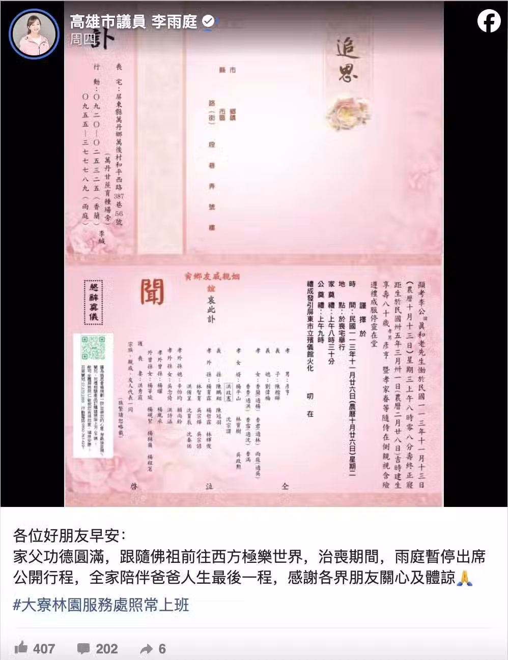 李雨庭也感謝外界關心「家父功德圓滿,跟隨佛祖前往西方極樂世界,治喪期間,雨庭暫停出席公開行程,全家陪伴爸爸人生最後一程,感謝各界朋友關心及體諒」。