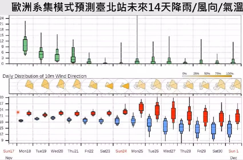 而周三到五之間,東北季風持續影響,起初為苗栗以北、宜花局部有雨,午後為苗栗山區、花東山區零星短暫雨,周四起局部短暫雨則集中北北基宜,午後剩下山區、花東有零星短暫雨。