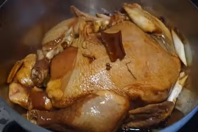 1.今天使用的是3斤的大雞一隻,看著頭和爪子害怕,已經切掉了。將這隻雞洗乾淨,加入食材表的所有食材,給它來個全身spa按摩。密封起來,放入冰箱冷藏一夜最入味。雞肚子裡面塞入一些大蔥。