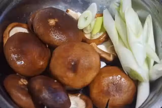 2.第二天的雞已經腌制的非常入味了,我們來準備一些配料。香菇是必須的,必須要它才好吃,大蔥也是必須的,此時它比洋蔥更美味,因為我們要把它放入雞肚子裡面,這個味道絕了。香菇和大蔥放入雞肚子裡面之後,用牙籤封口。