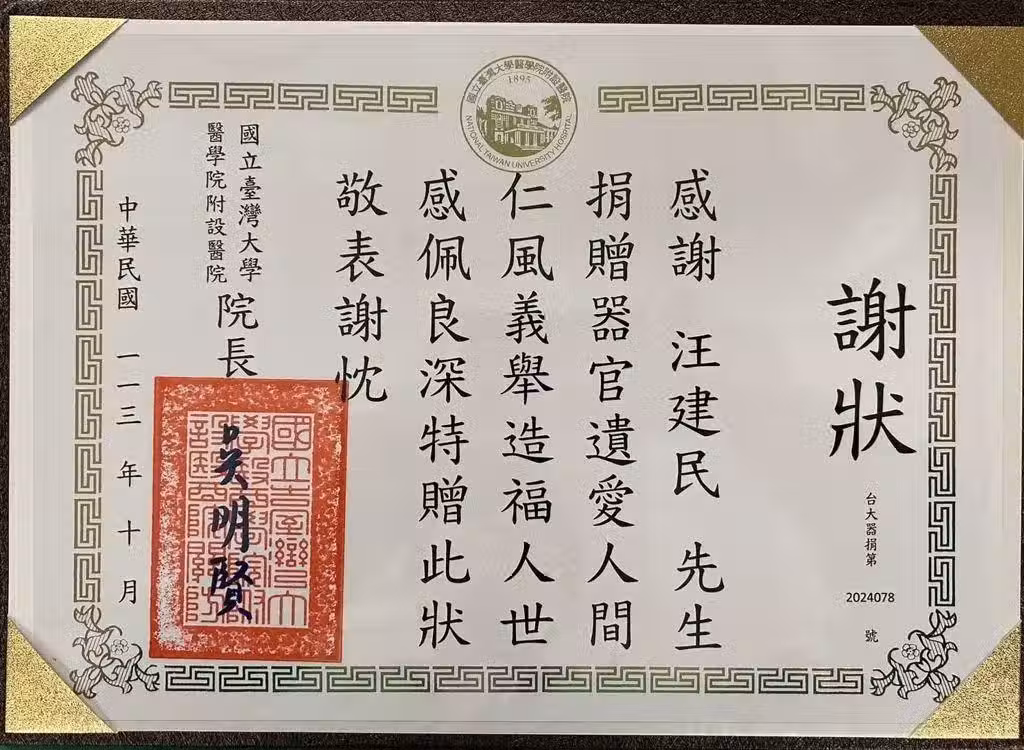 汪建民眼角膜捐獻完成,女友曬器官捐獻感謝狀,落淚形容已圓滿惹人淚目