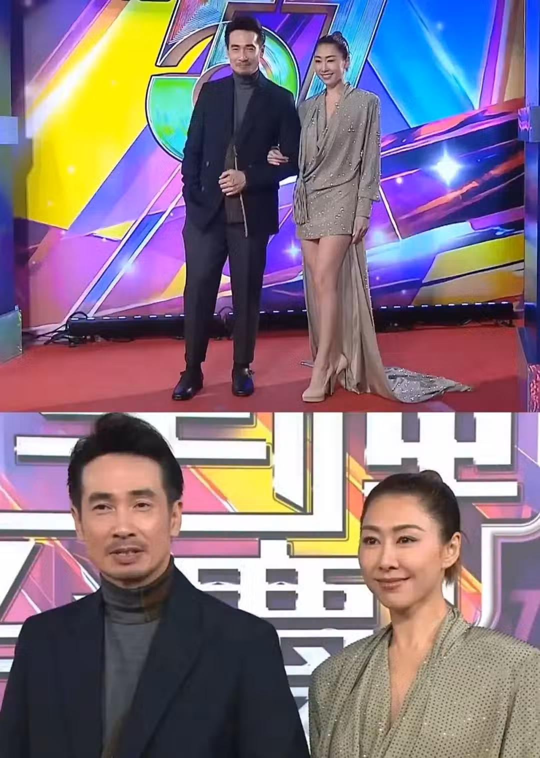 陳豪穿了一套深色休閒西服,這些年他很喜歡蓄鬍子的造型,看起來更具熟男魅力。胡定欣穿了一條卡其色珠光禮服,搭配簡約的丸子頭盤發,很是颯爽。