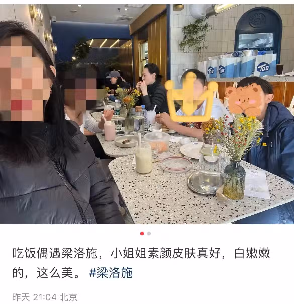 (11月20日),有網友在社交平台曬出偶遇梁洛施和兒子在餐廳用餐的照片,並配文大讚「小姐姐素顏皮膚真好,白嫩嫩的,這麼美」。