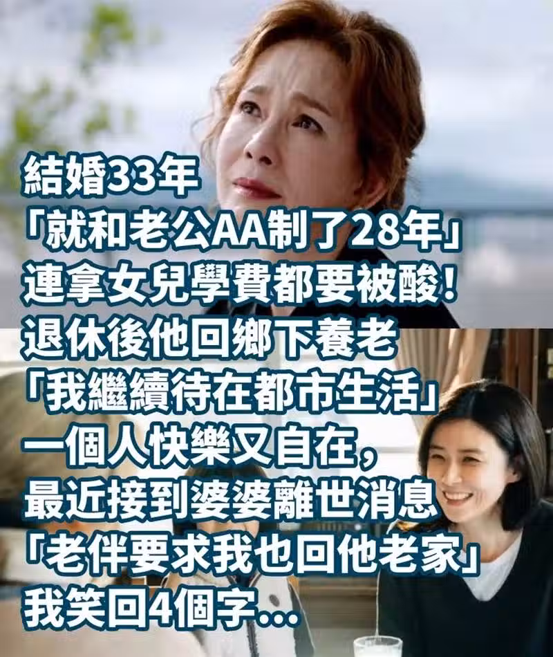 結婚33年「就和老公AA制了28年」連拿女兒學費都要被酸! 退休後他回鄉下養老「我繼續待在都市生活」一個人快樂又自在,最近接到婆婆離世消息「老伴要求我也回他老家」我笑回4個字!