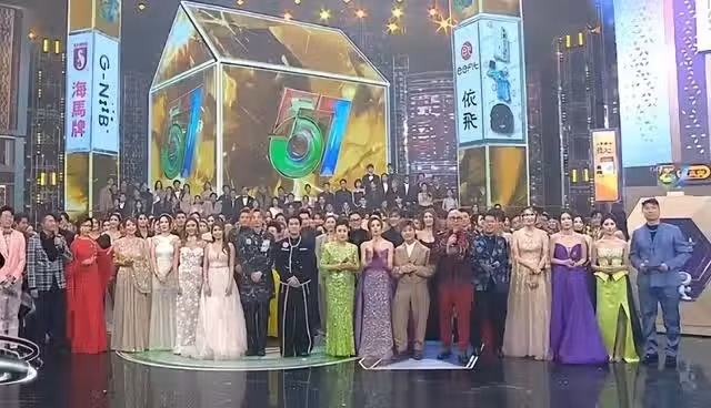 各位小生、花旦,都站在汪明荃兩側一字排開。汪明荃旁邊的,分別是兩大一線男星陳豪、馬國明,很明顯這兩人就是現在TVB的一哥和二哥。