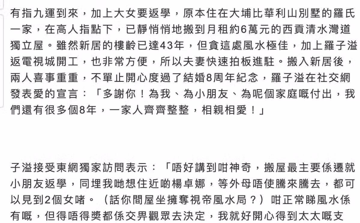 對於搬家這件事,羅子溢受訪的時候並沒有否認搬家是與風水學有關,他指搬家是為遷就孩子上下學。羅子溢的女兒讀的是名校,距離他們之前住的大埔很遠,日常接送孩子的確不方便。而搬到西貢清水灣,也方便楊茜堯的母親可以見到孩子,另外西貢清水灣的獨立屋離楊茜堯的姐姐楊卓娜的住所也比較近,方便走動,還有一個原因,此處往返TVB電視城也比較便利。至於風水的原因,羅子溢的確沒有否認,他坦誠決定搬來之前也看了風水,這是必要的,當然為了防止被過度解讀,他並沒有解釋太多。