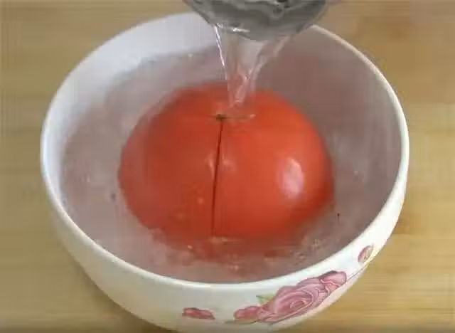 1.大家好,最近天氣越來越冷了,今天分享個開胃清淡又營養的暖身湯。先在西紅柿頂部打十字花刀,用開水燙幾分鐘。