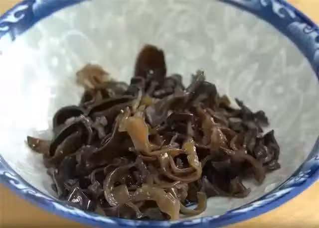 6.提前泡發好的木耳,把根部的硬蒂去掉,切成絲。