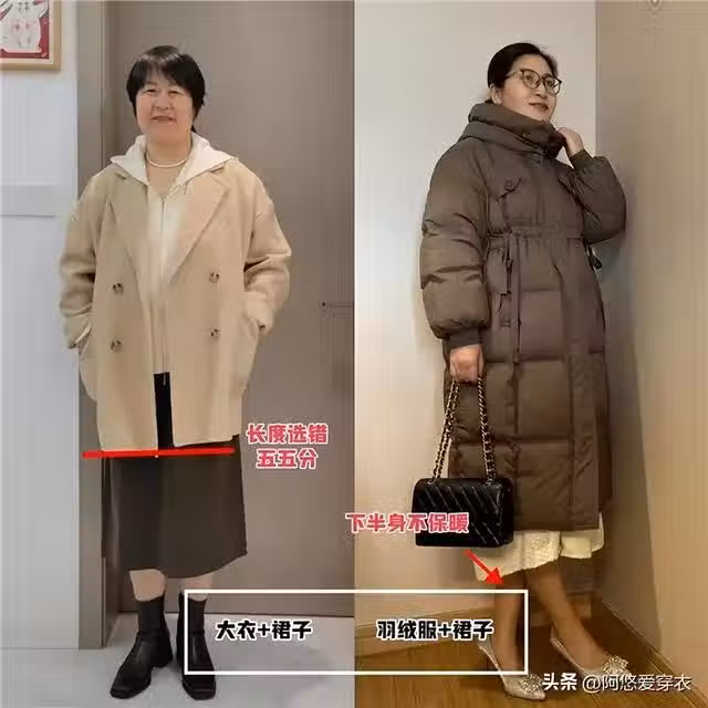 大衣和羽絨服雖然保暖,但選錯了長度,那可是真心顯矮啊!大衣和羽絨服和裙長不匹配,就很容易顯得比例五五分。