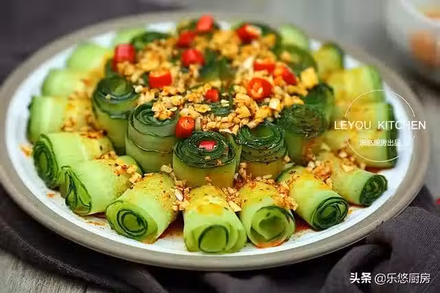 第三步:將黃瓜片捲起來,如圖,然後擺到盤中。