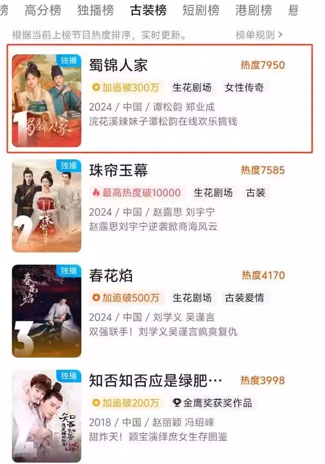 《蜀錦人家》講述了浣花染坊的季英英(譚松韻飾)臨危受命學習父親的染色秘方,她與楊靜瀾(鄭業成飾)攜手對抗外敵,守護了蜀錦行當,並將蜀錦帶往絲綢之路,揚名海外。
