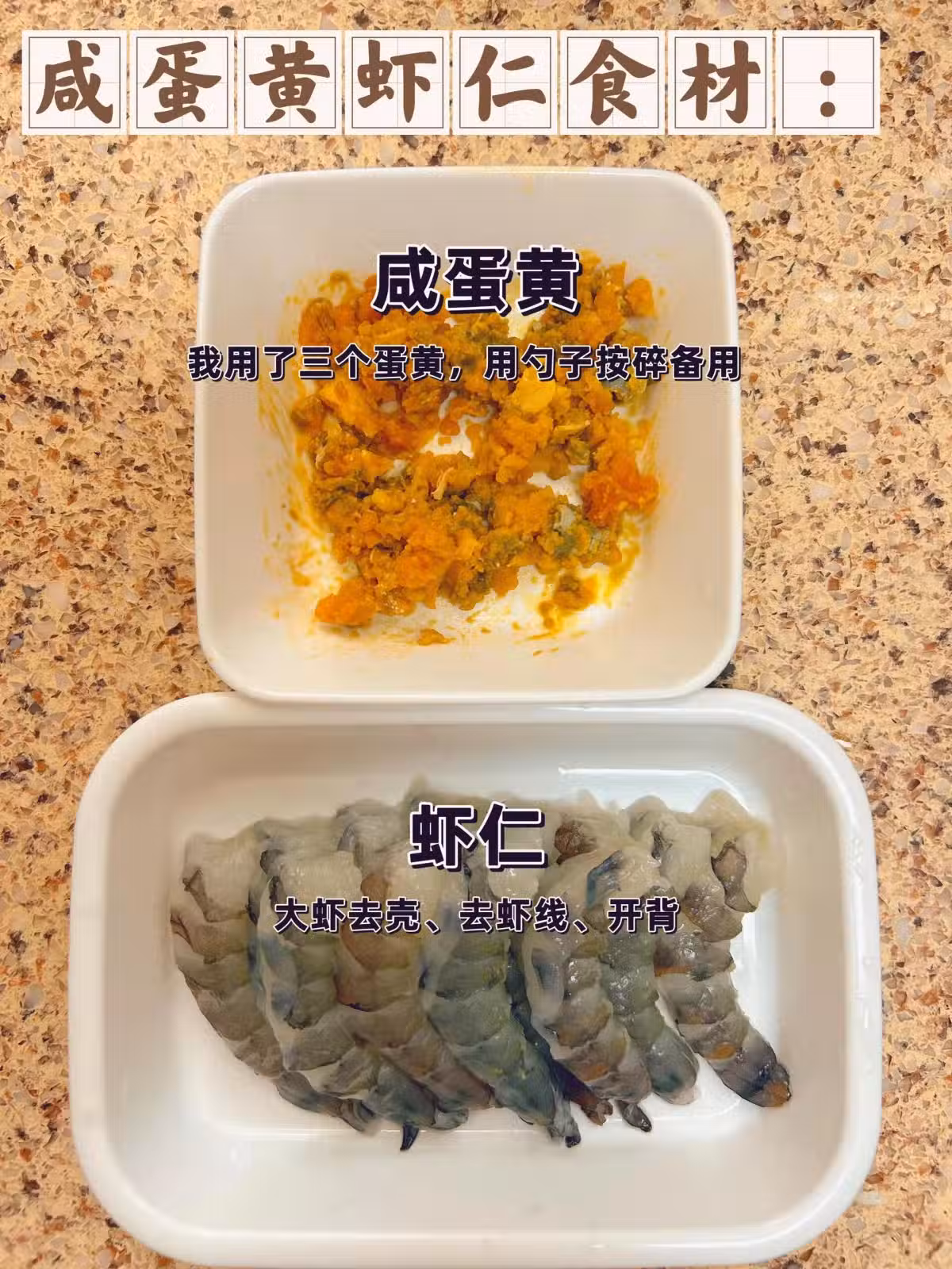 食材:鹹蛋黃(我用了三個蛋黃,用勺子按碎備用)、蝦仁(大蝦去殼、去蝦線、開背)