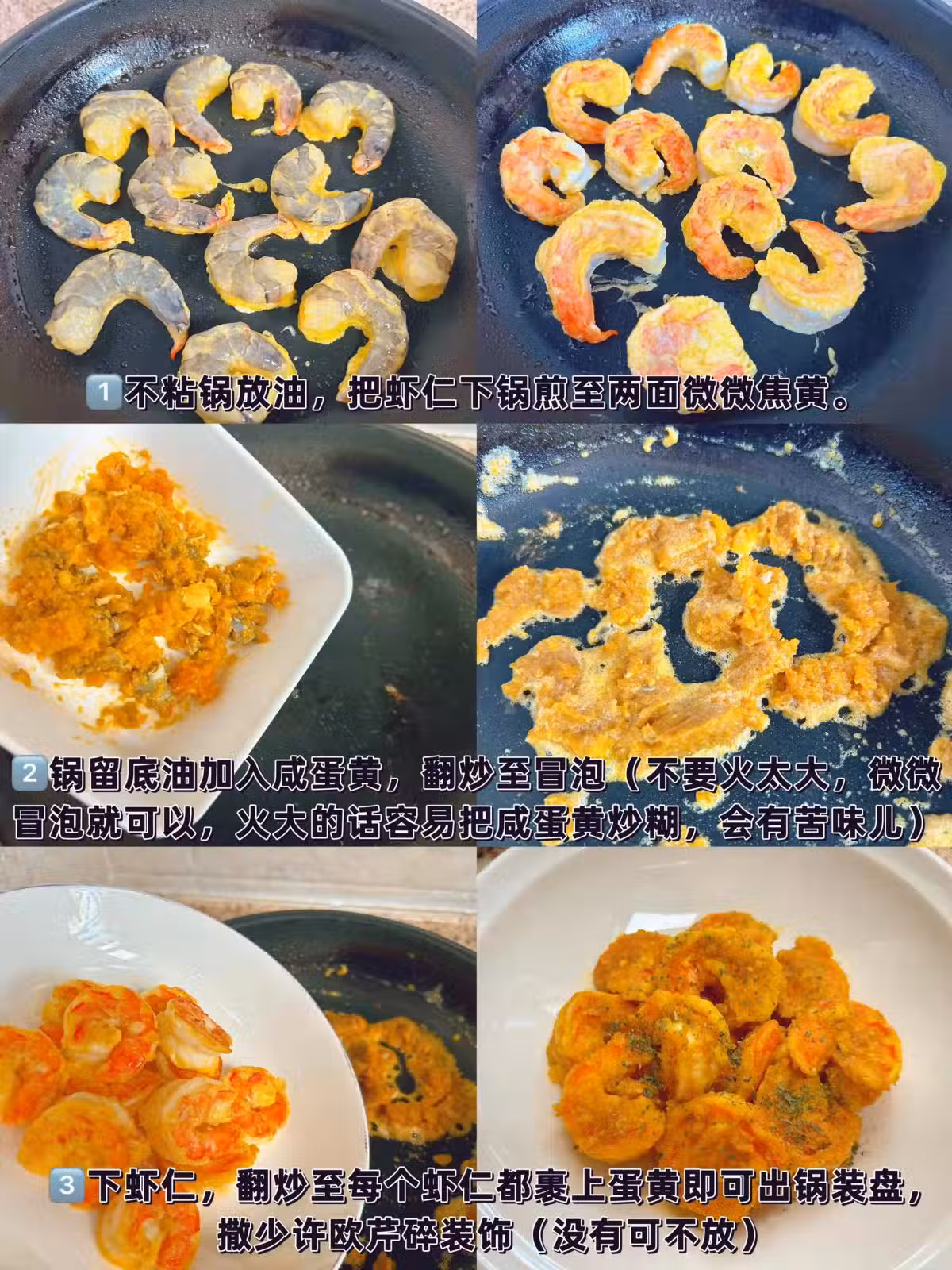 3️⃣下蝦仁,翻炒至每個蝦仁都裹上蛋黃即可出鍋裝盤,撒少許歐芹碎裝飾(沒有可不放)