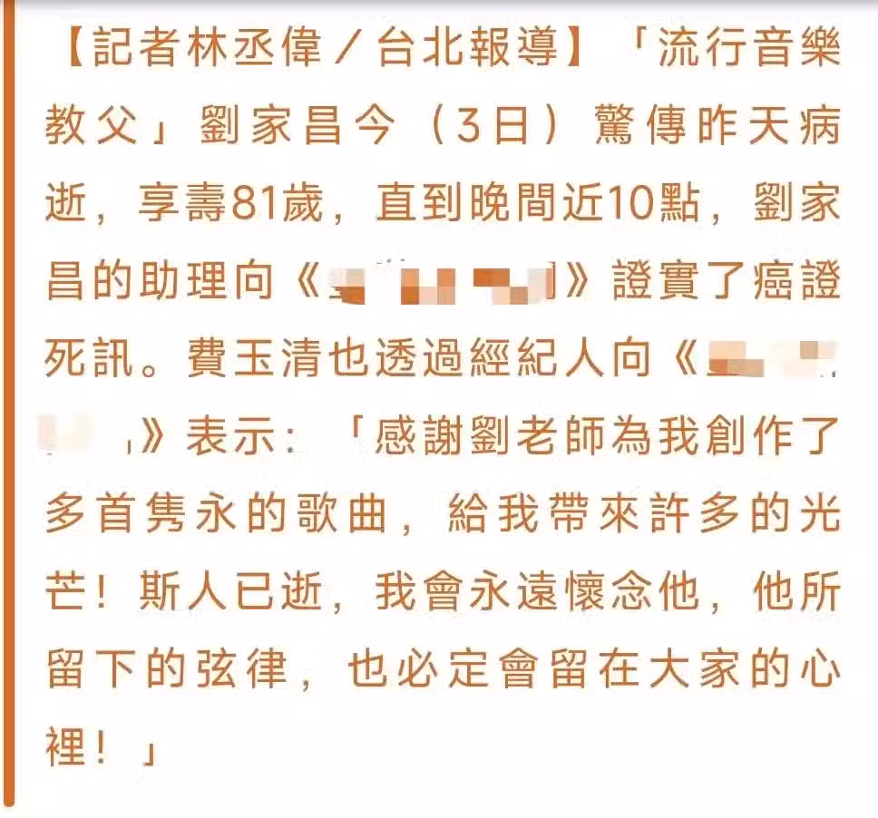 而與他合作過的費玉清,也在封麥5年後罕見發聲,當得知劉家昌離世後,通過經紀人向台媒表示,自己會永遠懷念他。