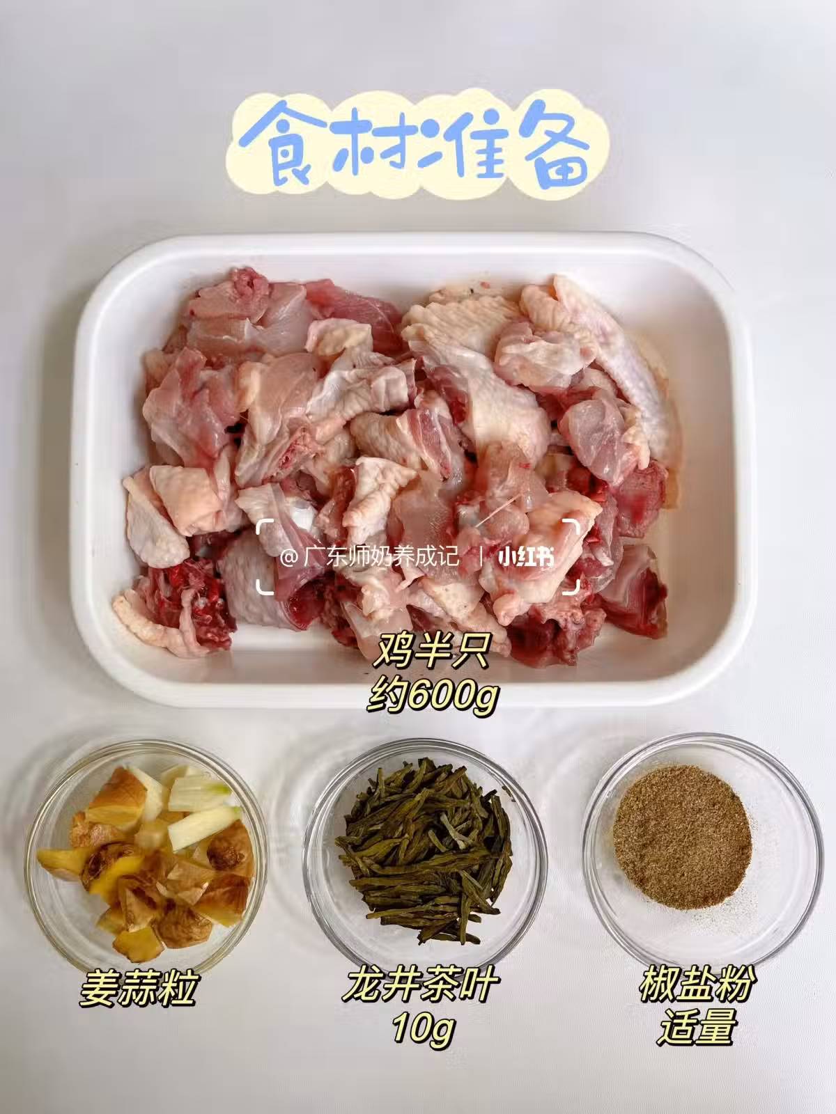 📝【食材】:雞肉,龍井茶,姜蒜,蔥花,椒鹽粉