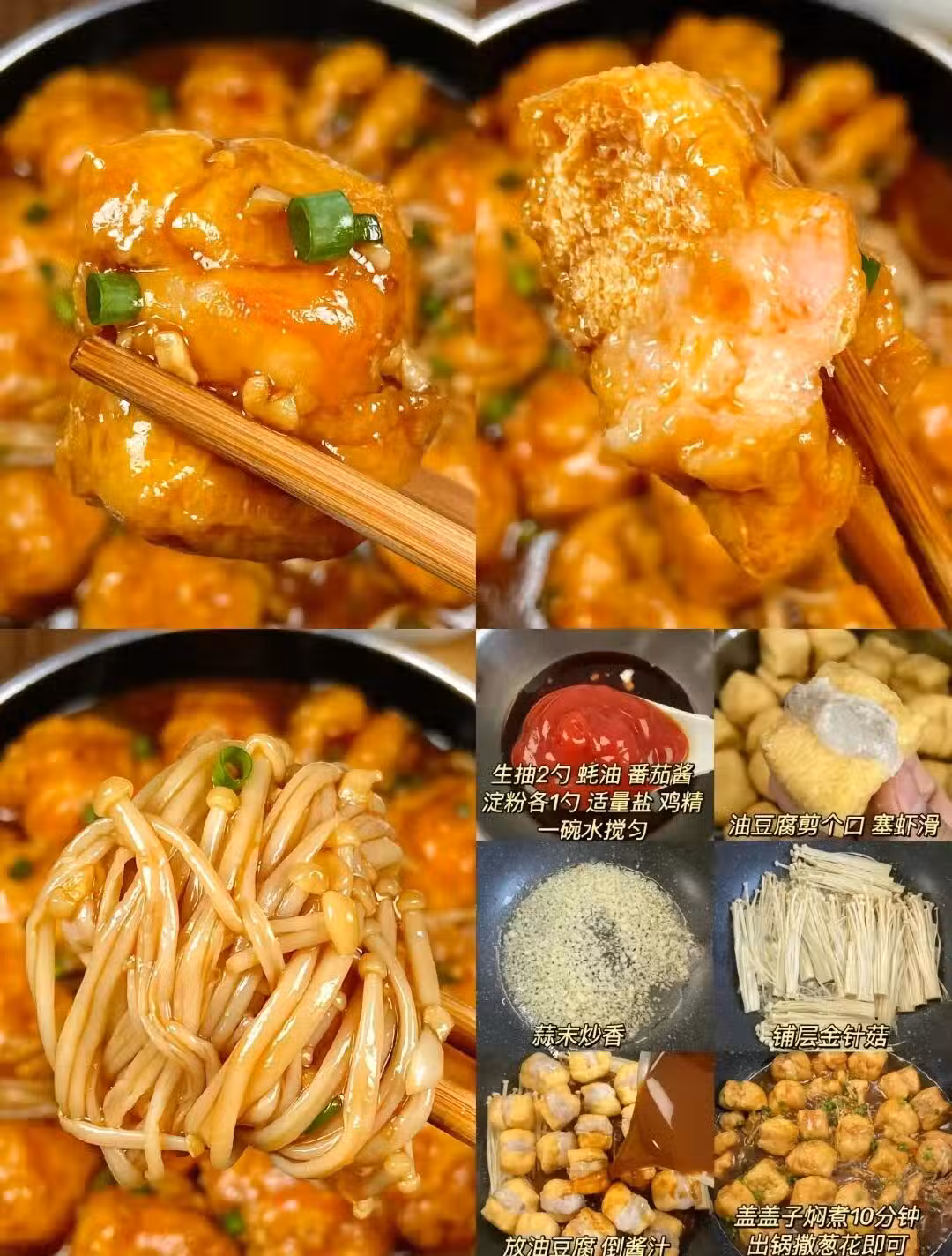 2.油豆腐剪個口 塞蝦滑,蒜末炒香 鋪層金針菇