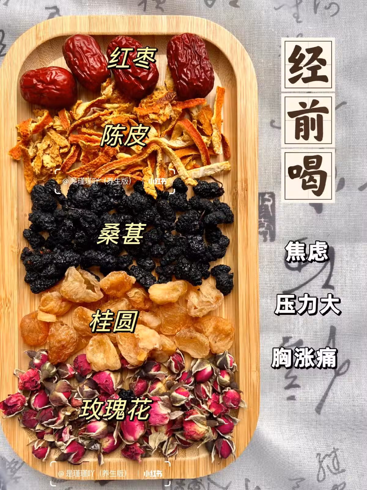 ❤️經期前:桑葚、陳皮、玫瑰、桂圓和紅棗。