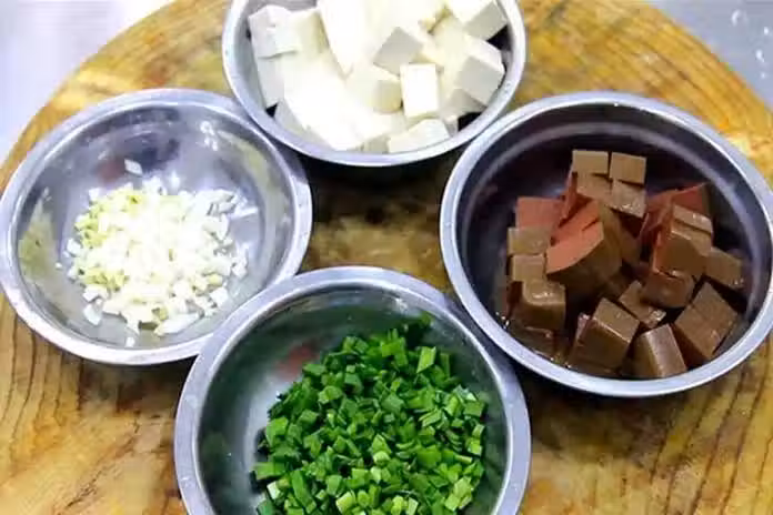 一、豬血推薦做法:【豬血燒豆腐】1.準備一塊嫩豆腐、切成方丁;豬血一塊,也切成同樣的方丁;大蒜拍扁、切成碎末,大蔥破開、切成蔥花,另外切一點韭菜花備用。