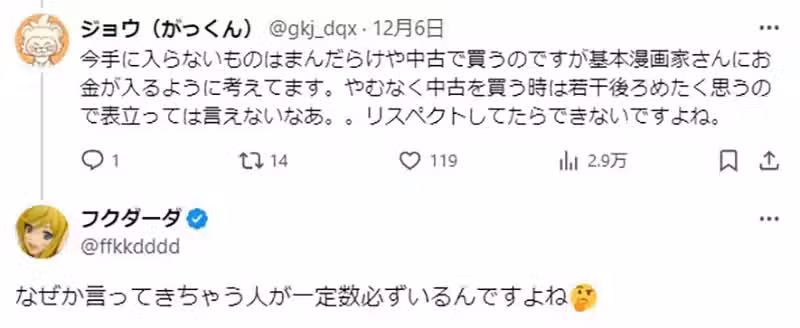 《漫畫家フクダーダ》批評讀者買二手書還特地告訴他,這種妨礙生意的留言都直接封鎖