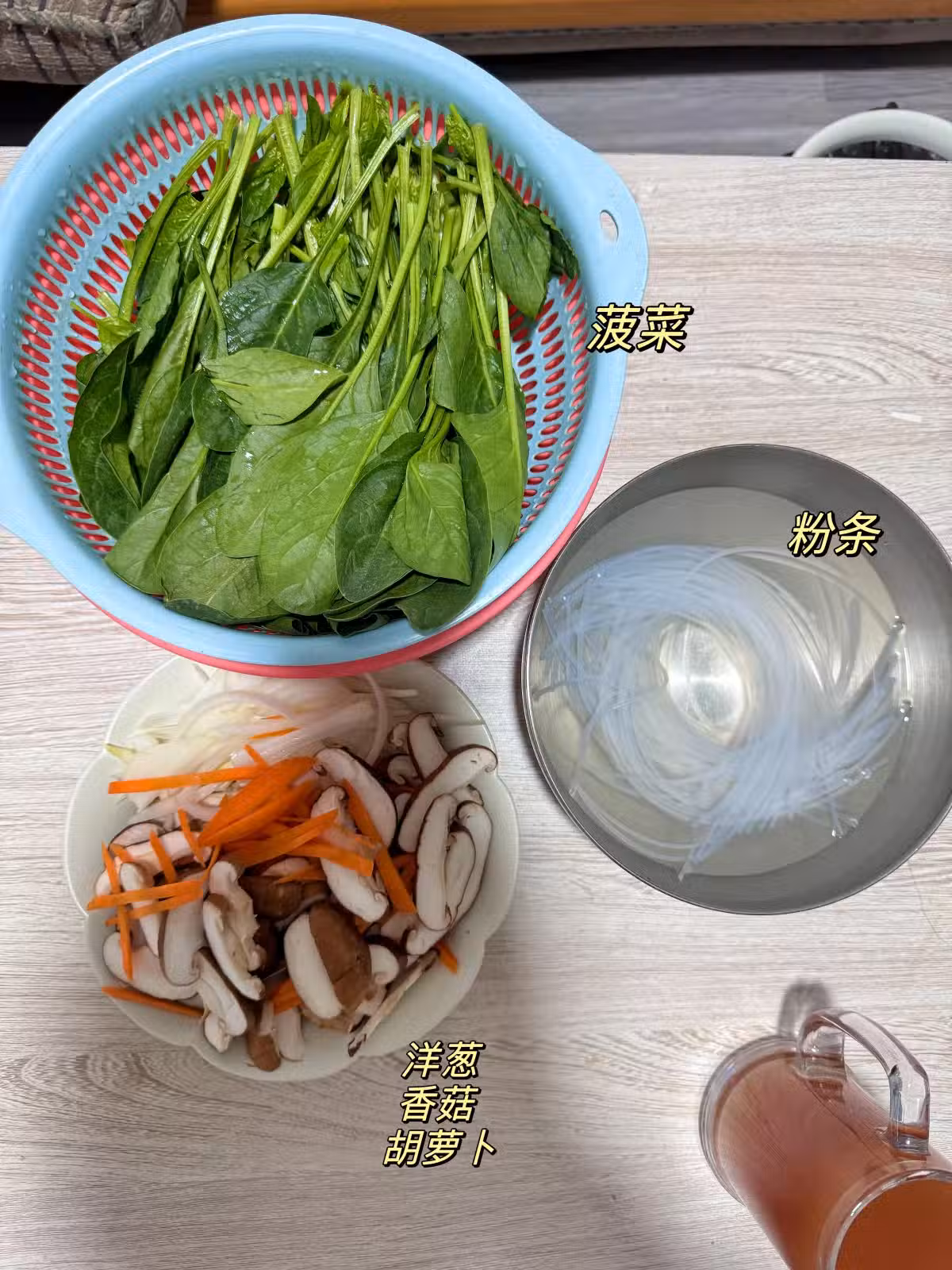 食材:菠菜 洋蔥 胡蘿蔔 香菇 粉條 生抽 鹽 牛肉粉或雞精 白糖