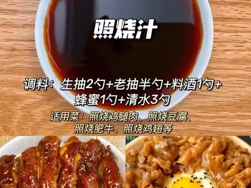 配比:生抽2勺、老抽半勺、料酒1勺、蜂蜜1勺、清水3勺。 照燒汁甜咸適中,光澤度極佳。將雞腿肉或肥牛片煎至金黃後,淋上這款醬汁,即可品嘗到美味的照燒菜肴。適用於照燒雞腿肉、照燒豆腐、照燒肥牛、照燒雞翅等。照燒汁的甜咸口感和光澤度,能讓這些照燒類菜肴更加美味誘人。