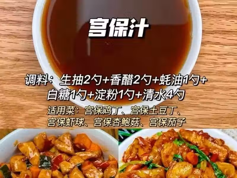 配比:生抽2勺、香醋2勺、蚝油1勺、白糖1勺、澱粉1勺、清水4勺。 宮爆汁酸甜適中,微辣可口,是宮保雞丁等菜肴的絕配。將雞丁與這款醬汁快速翻炒,即可品嘗到宮廷般的美味。適用於宮保雞丁、宮保土豆、宮保蝦球、宮保杏鮑菇、宮保茄子等