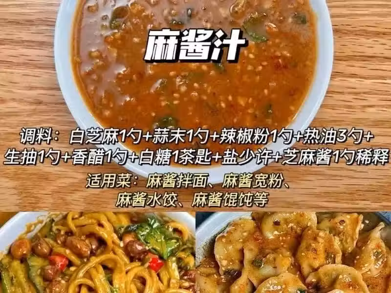 配比:白芝麻1勺、蒜末1勺、辣椒粉1勺、熱油3勺、生抽1勺、香醋1勺、白糖1茶匙、鹽少許、芝麻醬1勺(需稀釋)。 麻醬汁醇厚濃郁,香氣四溢。用它來拌面或水餃,都能讓你感受到北方風味的獨特魅力。適用於麻醬拌面、麻醬寬粉、麻醬水餃、麻醬餛飩等。麻醬汁的醇厚口感和獨特香氣,能為這些麵食或餛飩增添豐富的味道