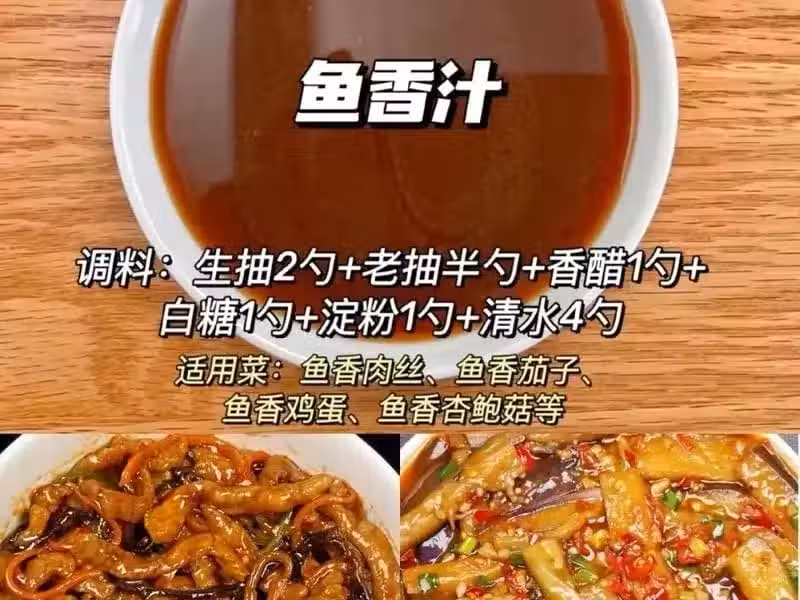 配比:生抽2勺、老抽半勺、香醋1勺、白糖1勺、澱粉1勺、清水4勺。 魚香汁口感獨特,帶有魚香味但並不含魚。用它來炒制肉絲或茄子,都能讓你品嘗到四川菜肴的經典美味。適用於魚香肉絲、魚香茄子、魚香雞蛋、魚香杏鮑菇等。魚香汁的獨特口感和香氣,能讓這些魚香類菜肴更加美味可口