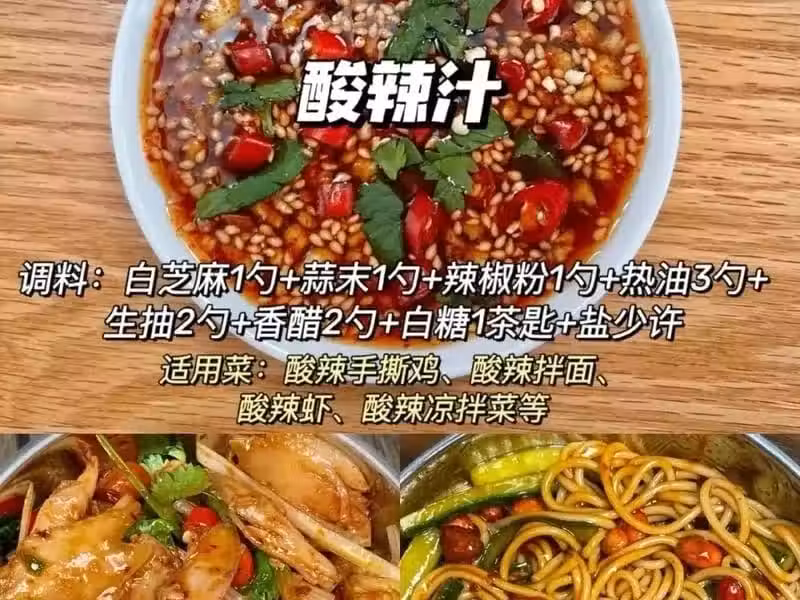 配比:白芝麻1勺、蒜末1勺、辣椒粉1勺、熱油3勺、生抽2勺、香醋2勺、白糖1茶匙、鹽少許。 酸辣汁酸辣開胃,鮮香四溢。用它來製作酸辣手撕雞或酸辣拌面,都能讓你在炎炎夏日裡食慾大增。適用於酸辣手撕雞、酸辣拌面、酸辣蝦、酸辣涼拌菜等。酸辣汁的酸辣口感和開胃效果,能為這些酸辣類菜肴增添更加濃郁的風味。