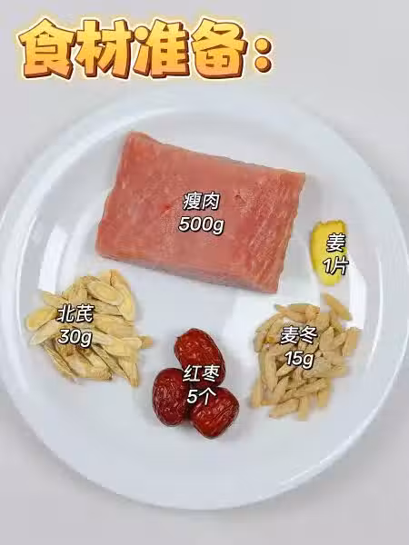 準備食材:紅棗5個、麥冬15克、薑片一片、北芪30克、枸杞!