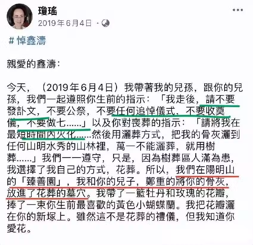 不過,瓊瑤生前不止一次和自己的兒子陳中維、兒媳何琇瓊提到過,自己的葬禮要一切從簡,不對外公開舉行拜祭,不發訃告訃聞,不要做七,不要舉行任何追悼儀式,要儘快火化,儘早花葬。