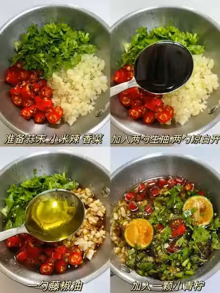 準備食材:蒜末、小米椒、香菜、青檸、雞腿。