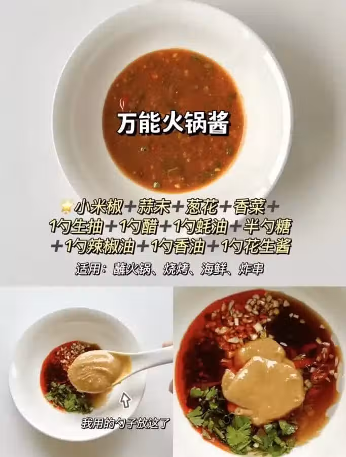 小米椒+蒜末+蔥花+香菜+1勺生抽+1勺醋+1勺蚝油+半勺糖+1勺辣椒油+1勺香油+1勺花生醬