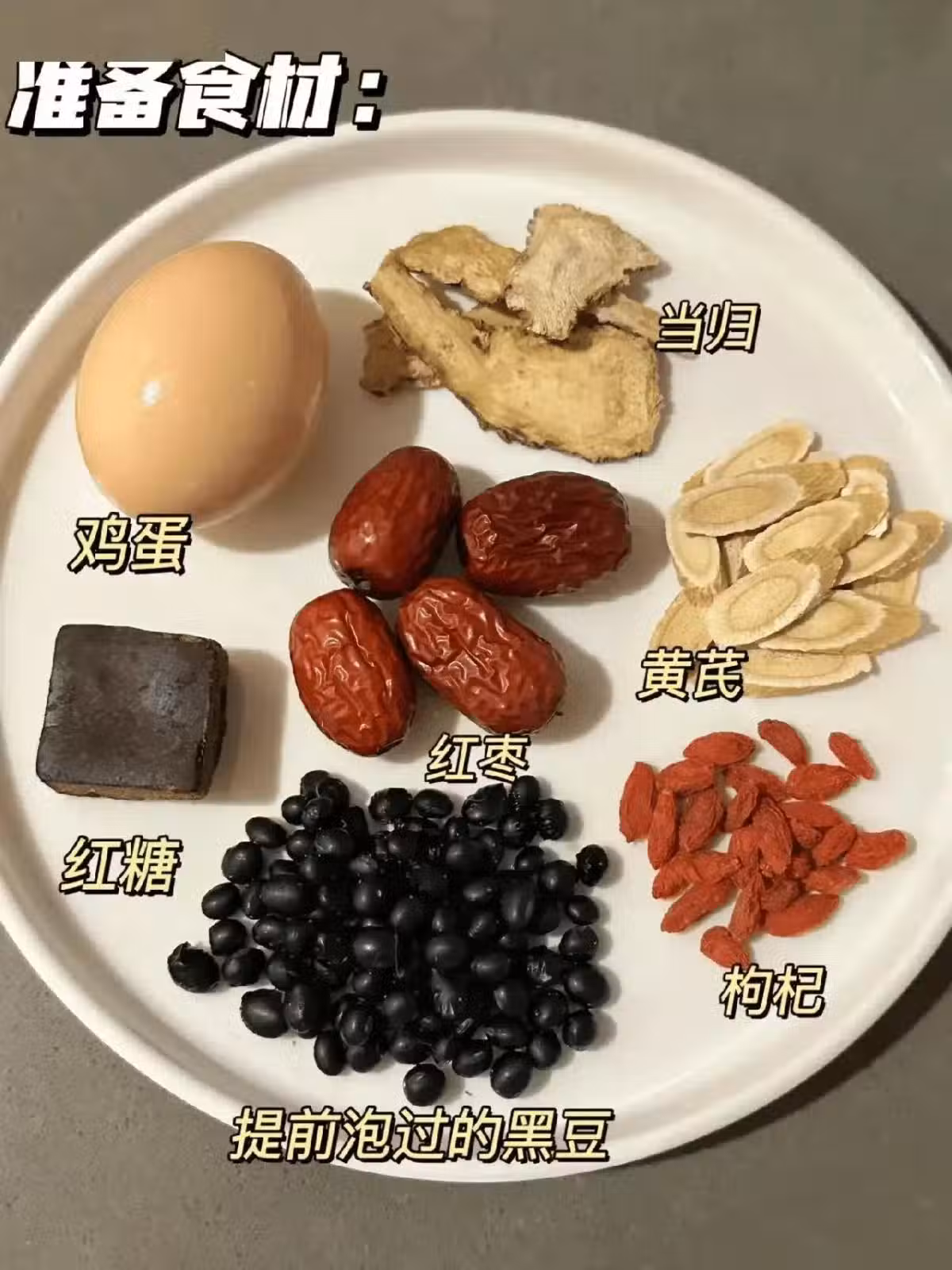 我媽的這個配方搭配是:紅糖、雞蛋、黑豆、枸杞、黃芪、當歸、紅棗!