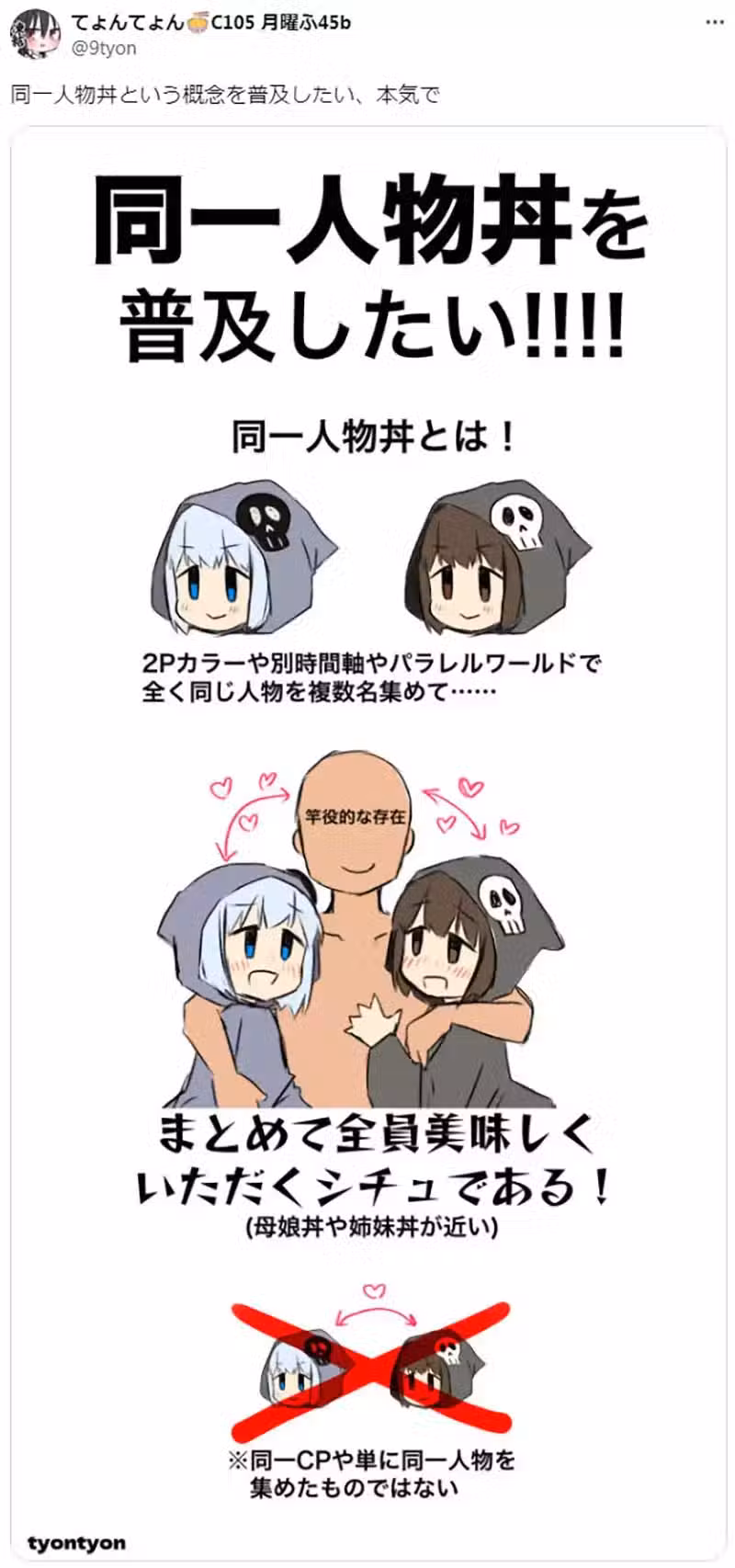 日本同人繪師てょんてょん(Tyontyon)最近在X發表了一種被他稱為「同一人物丼」的設定,還說想要致力推廣。