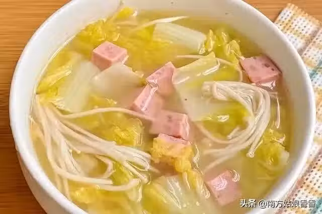2、起鍋燒油,放入火腿翻炒幾下,加入清水煮開,放入金針菇和娃娃菜。