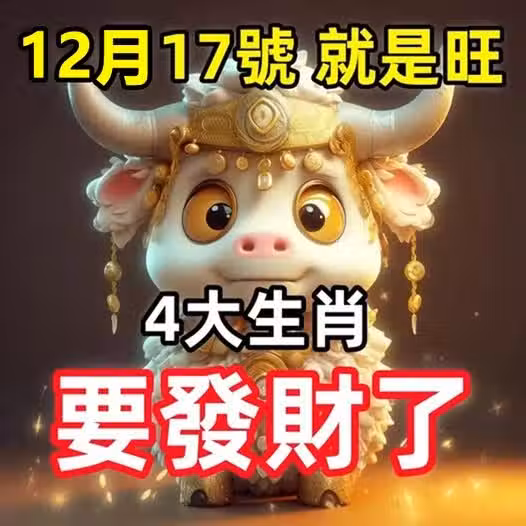生肖牛: 最近運勢上升明顯,尤其在12月17日這天,財星高照,偏財運尤其旺盛。 可能會有意外之財降臨,比如投資回報、彩票中獎或者朋友介紹的賺錢機會。 同時,工作上的表現也會得到上司的認可,收入有所增加。