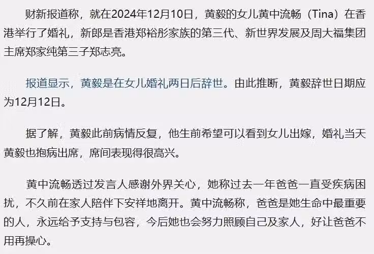 報道指出,黃毅生前病情復發,希望看到女兒出嫁,抱病出席當日的婚禮,席間表現得很開心。