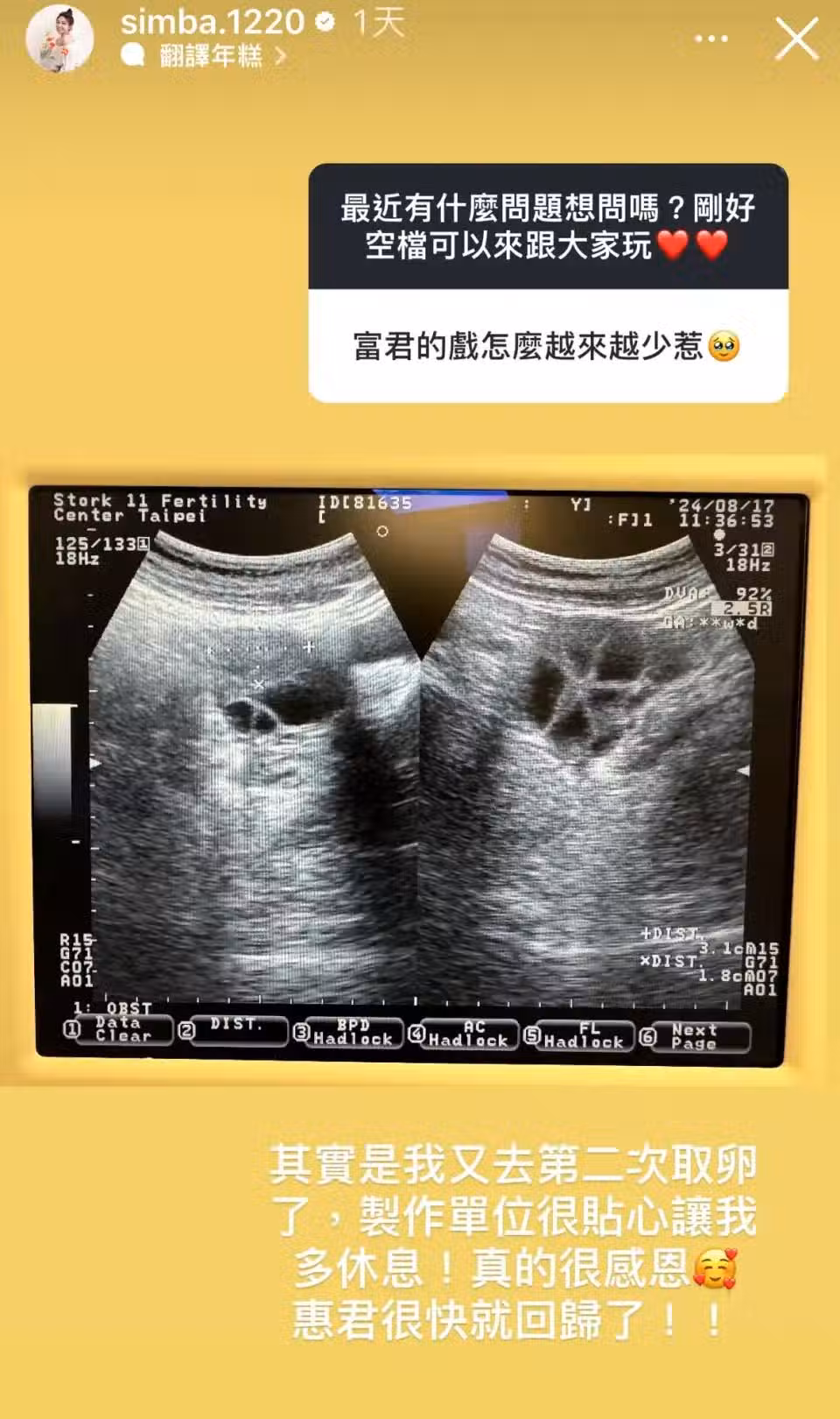 曾智希昨(20)日在IG開啟回復粉絲提問,談及為何在八點檔中戲分變少,她曬出超音波照,透露最近進行第二次取卵手術,製作單位貼心體恤才讓她多休息:「真的很感恩,惠君(角色)很快就回歸了!!」卻有人誤會她有喜,嗨喊「恭喜你懷孕」,曾智希則趕緊澄清「哎呀還沒啦,誤會大了!那是我的超音波取卵照。」