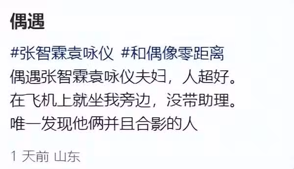 該網民分享了巧遇夫婦二人的舊照,並留言:「偶遇張智霖袁詠儀夫婦,人超好。在飛機上就坐我旁邊,沒帶助理。唯一發現他倆並且合影的人。」