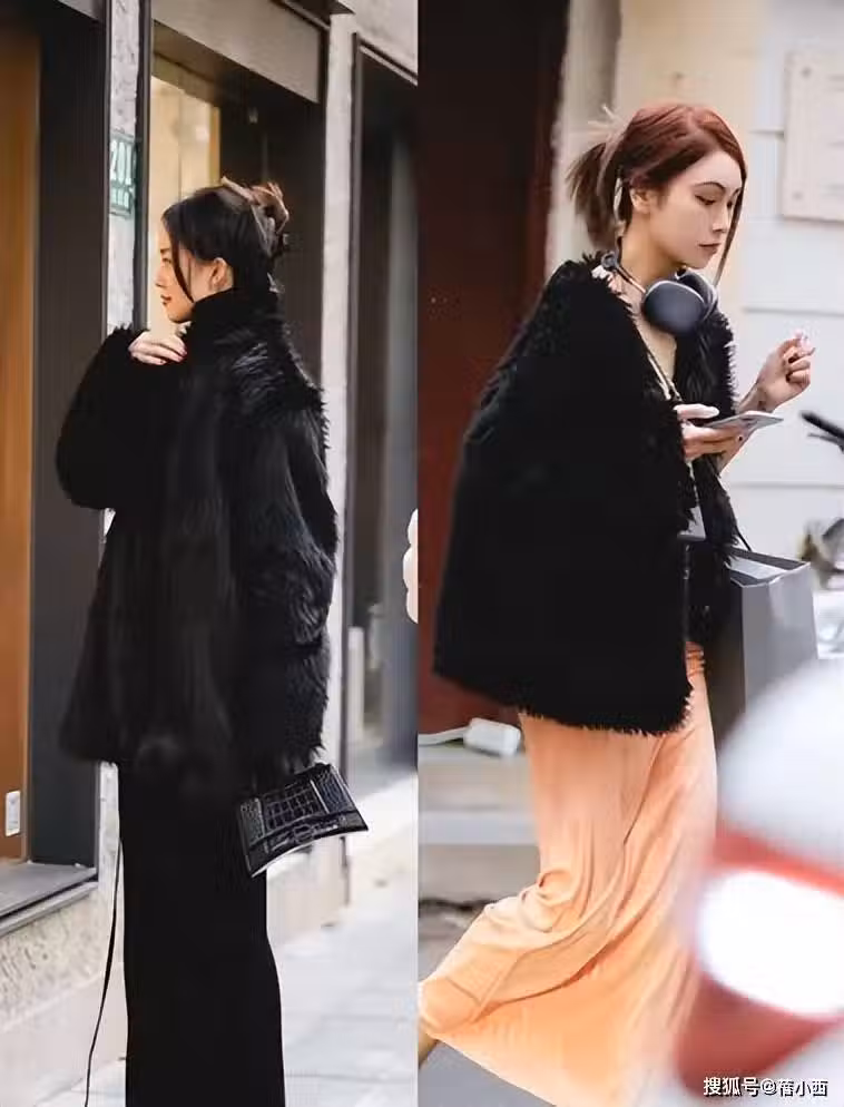 毛茸茸的外套在穿法上有多種變化,如果你不想穿的單一,可以試著用個性的撞色搭配凸顯層次感,深色的毛絨外套就可以搭配亮色的裙子,形成了對比就不會覺得單一了。