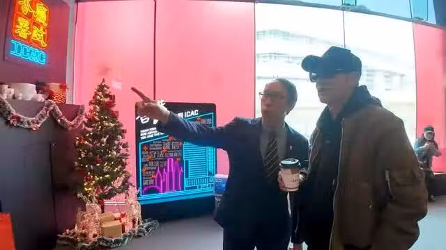 照片可見,頭戴黑色cap帽、一身黑色運動裝束配軍綠色風襤的任達華手執咖啡,在廉政公署ICAC的燈牌前與網民合照,另一張照片更見到任達華蹲在聖誕樹及一塊寫有「香港勝在有你同ICAC」的布景板前舉起手指公拍照。