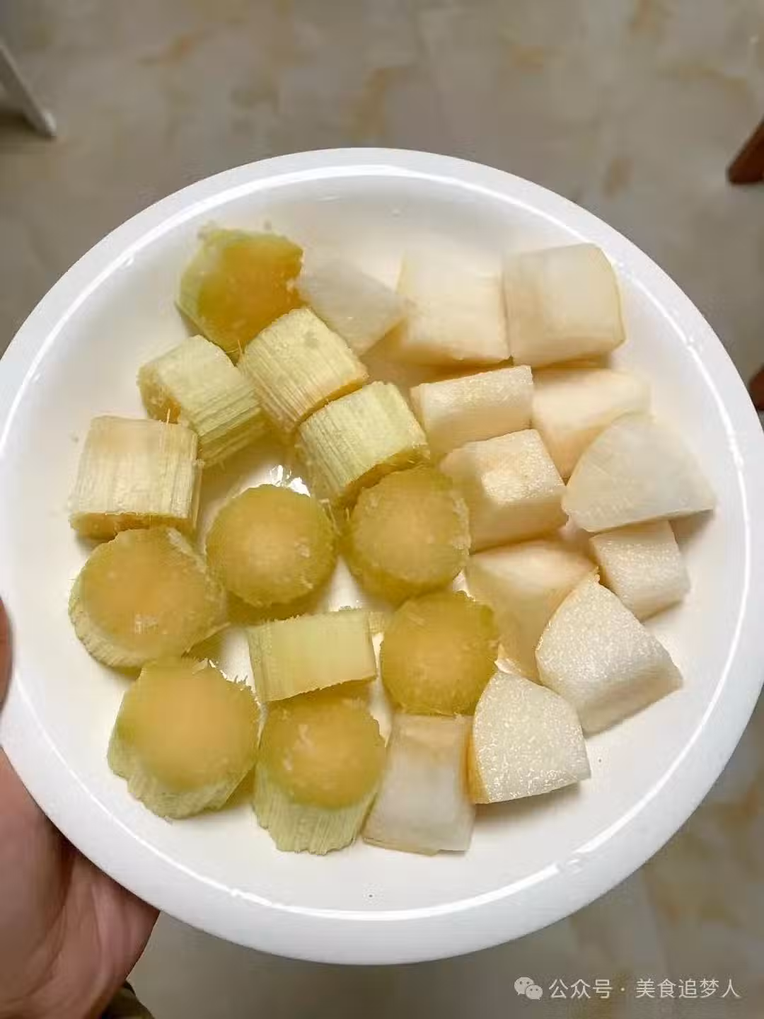 【做法】 1.青皮甘蔗和梨洗乾淨。 2.甘蔗去皮切小段、雪梨切塊。 3.加入適量清水煮10分鐘,轉小火煮5分鐘就可以了。
